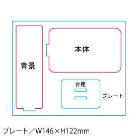 プレート/W146×H122×D3(mm) 本体/W96×H57×D3mm 背景/W34×H110×D3(mm) 台座/W50×H37×D3(mm)