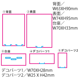 背面/W63XH90(mm)、表面/W74XH95(mm)、台座/W70XH33(mm)、デコパーツ1/W70XH28(mm)、デコパーツ2/W25 X H42(mm)